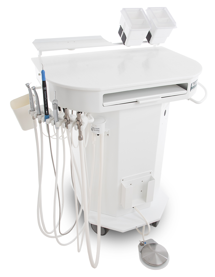 Includes two pneumatic handpiece connections, air/ water syringe, straight high-volume evacuator, saliva ejector, internal air compressor, internal interval vacuum pump with electric waste purge, and dual closed water bottle system with waterline disinfection treatment cartridge. Back/side rail storage system include two storage bins, one shelf, and one small hazard waste bin. White powder coat finish, solid surface worktop, and heavy-duty 4″ casters.