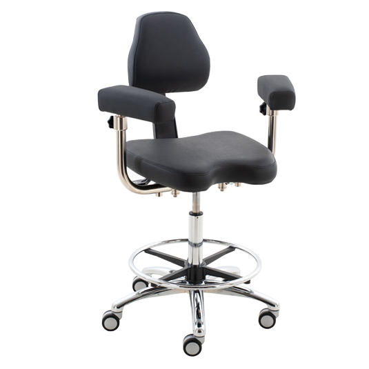 This Dental Assistant’s Chair configuration includes two padded adjustable armrests for ergonomic support, tall cylinder, and adjustable foot ring.